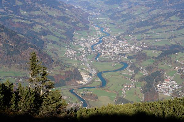 In interessanten Kurven mäandert die Salzach durch das mittlerweile in diesem Bereich völlig nebelfreie Tal ...