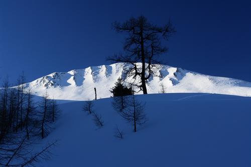 | Während ich über die rechte Seite des Roßkopf zum Imbachhorn aufsteige, wird mich mein Rückweg auf der linken (östlichen) Seite über eine steile Abfahrtsvariante herunterbringen. |