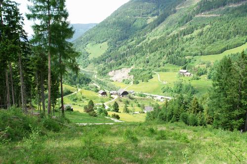 | Von der Strickeralm geht es am Anstiegsweg über die Forststraße und einer Abkürzung hinab ins Tal. Links der Bildmitte erkennt man ein Zipfelchen des Großsölker Stausee´s. |