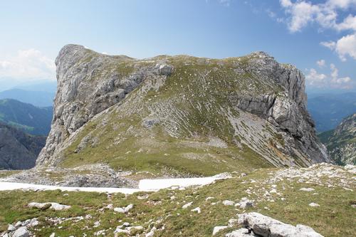 | Schien der Kemetstein beim Aufstieg (über die rechte Bildseite) durch die schroffen Felswände für Wanderer unbesteigbar, so zeigte er von seiner Nordseite ein völlig anderes - sein harmloses - Gesicht. Beim Tennengebirge gilt: Rauhe Schale, weicher Kern. |
