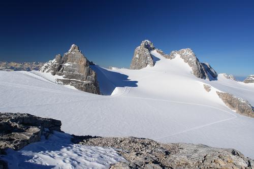 Dirndl, Hoher und Niederer Dachstein, davor der Hallstätter Gletscher.