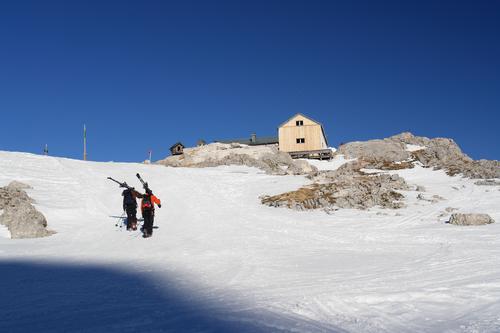 | 2 Schibergsteiger am Weg zur Simonyhütte. Nun muß ich mich aber wirklich schleunigst beeilen. Und so knapp wie heute war es wirklich noch nie. Wäre die letzte Gondel pünktlich um 16:50 Uhr abgefahren, hätte ich sie um 6 Minuten verpaßt. Eigentlich habe ich nicht damit gerechnet, sie noch zu erreichen. Über den Gletscher folgte ich nicht der präparierten Schiroute sondern dem inoffziellem Abfahrtsweg - kurzzeitig über nahezu blankes Gletschereis. Die dafür erforderlichen Harscheisen haben natürlich die Aufstiegsgeschwindigkeit weiter gedrosselt. Es hätte noch einige wirklich schöne Fotomotive gegeben (Gjaidstein in der Spätnachmittagssonne, Schneefahnen im Gegenlicht) - allein es mangelte an Zeit. |