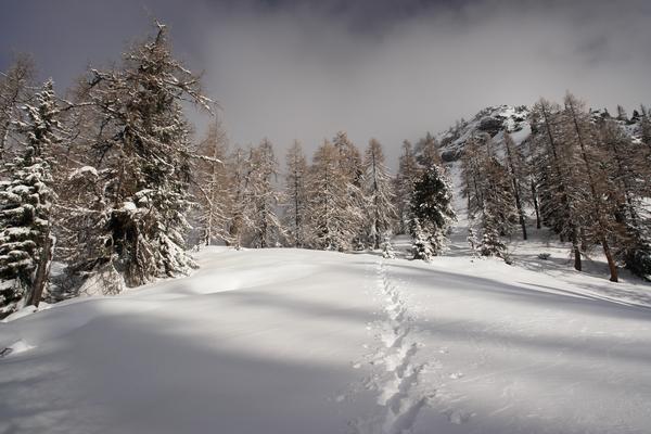 | ... die Schneeschuhspur weist uns den Weg. Da es nur eine Aufstiegsspur gibt, vermuten wir, dass der Schneeschuhwanderer im Winterraum der Liezener Hütte genächtigt hat und heute noch oben irgendwo unterwegs ist. Vielleicht werden wir ihn ja treffen. Das Auto am Ausgangsparkplatz würde dann auch gut in unsere Vermutung passen. |