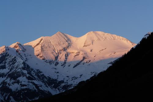| Als wir kurz vor 06:00 Uhr bei der Mautstelle Ferleiten ankamen, leuchteten die Bergspitzen um Sinwelleck (in einer Karte auch als Sonnenwelleck bezeichnet) und Fuscherkarkopf bereits verlockend herunter. |