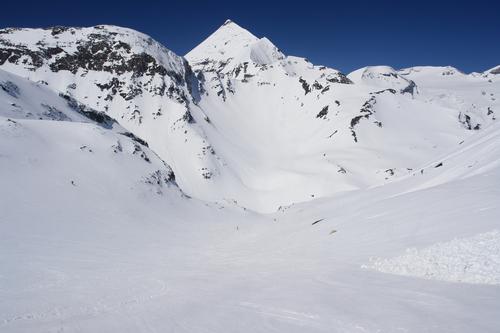 | Schließlich machen wir uns aber auf die Abfahrt. Vom Spielmann in die Spielmannscharte, und weiter bei besten Firnbedingungen über das tolle Spielmannkees, herrliche Gipfelblicke vor Augen. |