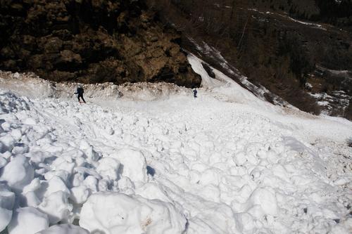| Weiter unten verengt sich der Pfandlgraben aber zusehends. Neben offenen Spalten über dem Bach und einem eindrucksvollen Lawinenkegel rutschen wir talwärts ... |