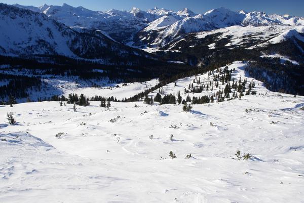 Blick zurück über das am am breiten Westrücken unschwierige Aufstiegsgebiet hinunter zum Almgebiet der Sauschneidalm.