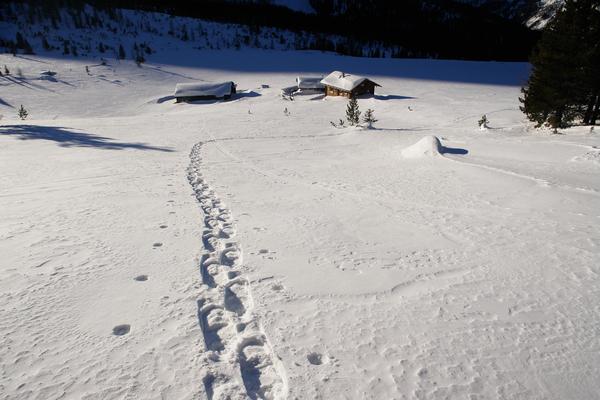 | Die heute sehr wechselhaften und für Schitouren nicht sonderlich attratkiven Schneeverhältnisse bestätigten mir die Wahl der Schneeschuhe als geeignerteres Fortbewegungsmittel. |