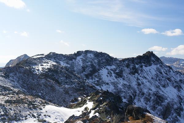 | Die 2 Wanderer, die mir kurz zuvor begegnet waren, unterwegs als winzige Punkte in Bildmitte am Gratübergang zum Krautwasch (rechts). Wir hatten vereinbart, dass ich sie von der Erzherzog-Johann-Hütte hinaus ins Ennstal mitnehmen werde. Sie wollten zuvor noch 3 Bier in der Hütte zischen. Nur die Hütte war bereits winterdicht gemacht. Der Durst dürfte sie dann autostoppenderweise doch schneller aus dem schattigen Talabschluß hinausgetrieben haben. |