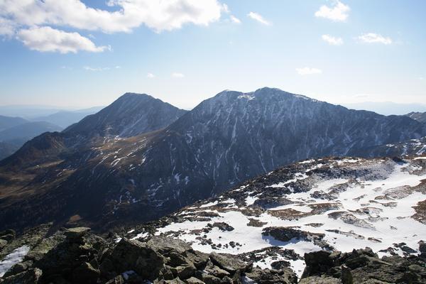| Egal aus welcher Perspektive ich die beiden heute in Augenschein nahm. Für mich hatte es den Anschein, als sei der Greim (links) der höchste Gipfel der Wölzer Tauern. Aber tatsächlich ist die Rettlkirchspitze - rechts - mit 2.475 Meter noch einen Meter höher. |