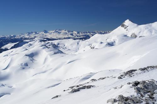 Ausblick nach Südwesten an der Hochweiß vorbei zum Dachstein ...