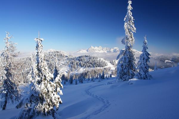 | Gemütlich ziehe ich meine Kurven zwischen den Bäumen. Im Hintergrund die Dachsteingipfel. Über dem Ennstal liegt heute lange Zeit Nebel. |