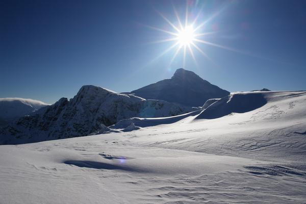 ... zuletzt wird das Gelände wieder flacher. Die Sonne strahlt über dem Strimskogel.