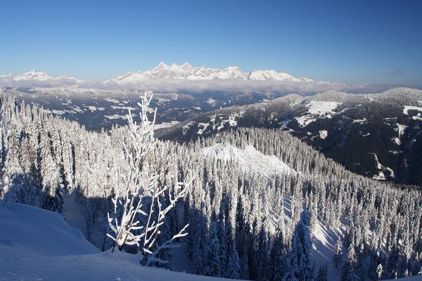 | Mit bestem Ausblick zu den höchsten Dachsteingipfeln, welche die Bundesländer Steiermark und Oberösterreich für sich beanspruchen wollen. Ein kleiner Anteil gehört auch zu Salzburg, welches aber auf wesentlich höhere Gipfel stolz sein kann. |