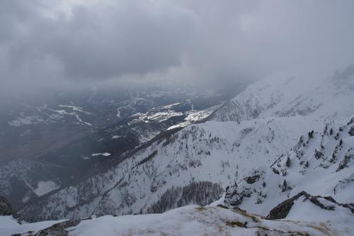 Ein kleines Sonnenfleckerl auf den schneebedeckten Wiesen der Ramsau. Links davon, unten im grünen Tal, erkennt man Schladming mit den weißen Schneebändern der Planai und Hochwurzen.
