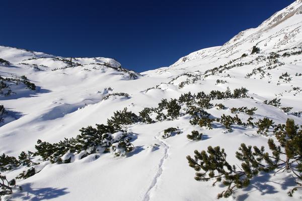 | Aufpassen muß man nur bei Annäherung an die Latschenfelder, die derzeit noch nicht ausreichend eingeschneit sind. Stellenweise "verschwinde" ich bis zur Hüfte im Gestrüpp. |