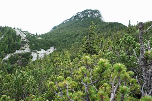 | Im oberen Bereich führt ein Steig, der sich gelegentlich in den Latschen verliert, auf das Mittereck. Irgendwo muß ich wohl falsch abgebogen sein. Die anfangs noch gut begehbaren Wildpfade werden allmählich immer schmaler und verwachsener und schließlich stecke in in einem undurchdringbaren Latschengürtel fest. In Luftlinie kaum mehr 100 Meter vom Mittereck entfernt. Aber es gab einfach kein Durchkommen mehr. |