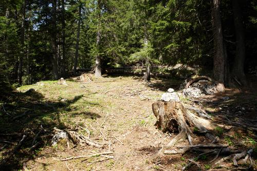 | Dann geht´s im Wald - kurz recht steil und feucht-rutschig - weiter. Auf einem Rücken sehen wir einen Wanderer in der Ferne, der einen geeigneten Abstiegsweg zu suchen scheint. Einige Steinmandln weisen den Weg. |