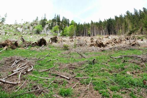 Über ein Windwurfgebiet talwärts zu 2 Hütten und am Almweg weiter ...