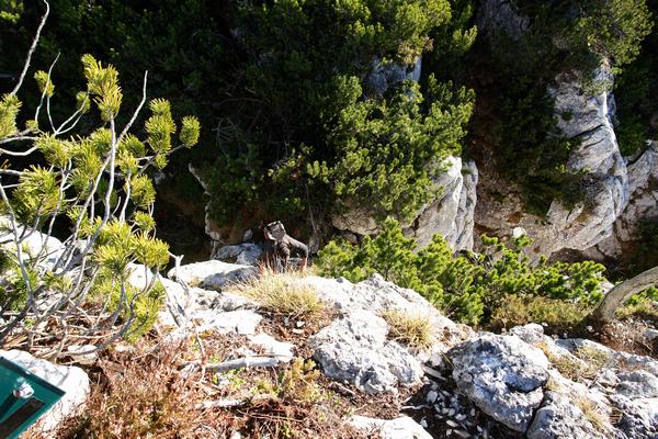 | Kurz vor dem Schlußfelsen gilt es am oberen Ende der steilen Rinne noch ein unwegsames Latschenfeld sowie tiefe, dunkel und bedrohlich warnende Dolinenspalten zu queren, zu denen im Vergleich die Hindernisse und Abenteuer des Indiana Jones geradezu wie ein lächerlicher Spaziergang anmuten |