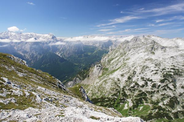 | Das Hochkönigmassiv im Süden mit den Gletscherresten der Übergossenen Alm. Unser Abstiegsweg wird uns durch das grüne Tal am unteren Bildrand führen. |