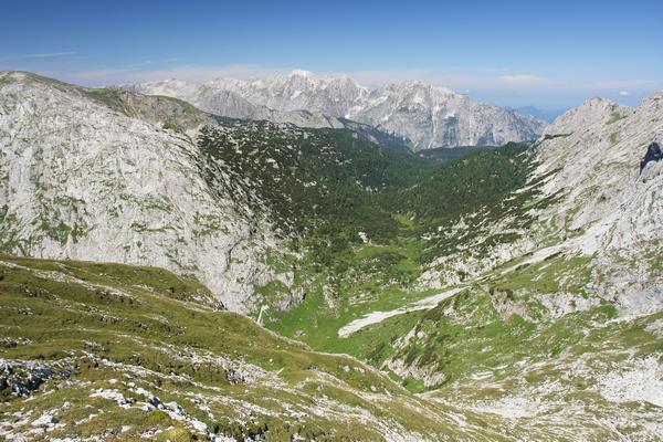 Ausblick vom Jägerskopf Richtung Norden auf einen grünen Taleinschnitt mit kleiner (Jäger?-)hütte (unterhalb der Bildmitte).