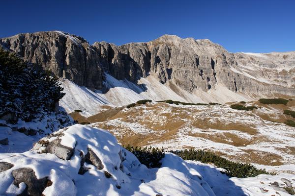 | Und so steige ich vom Sattelkoppen zunächst nordwärts ab - auch hier im Angesicht und Schatten großer und wesentlich bekannterer Nachbarn, die sich über dem Totental erheben. |