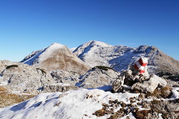 | Ab der Weggabelung Elmscharte-Warscheneck wird der Weg zunehmend felsiger und an einigen schneebedeckten oder vereisten Felstellen war das Fortkommen gar nicht so einfach. Mein Aufstiegsweg auf den Torstein wird im Übergang zwischen aperem und schneebedecktem Gelände verlaufen. |