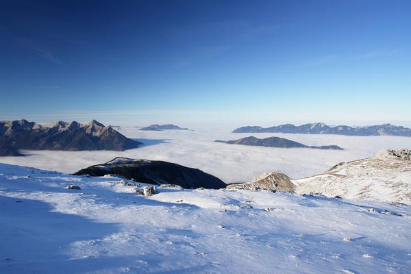 Ganz Oberösterreich unter Nebel - Ganz Oberösterreich ? Nein, einige Hügel wagen sich heraus.