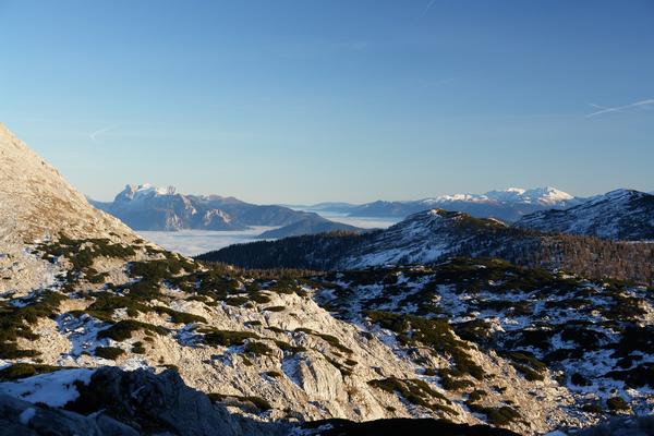 Nebel auch unten im Gesäuse und im Paltental. Rechts leuchten die schneebedeckten Gipfel der Rottenmanner Tauern.