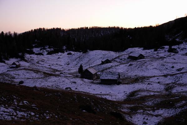 | Wie geplant und gerade rechtzeitig vor Einbruch der Nacht gelange ich wieder zurück zur Brunnalm. Die letzten 2 bis 2,5 Stunden kann ich nun auf bereits bekannten Pfaden meinen Aufstiegsspuren folgen. |