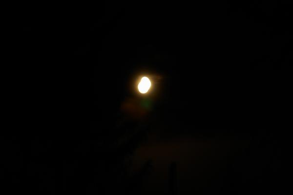 | Zwischen einer Höhe von 1.300 und 1.100 Meter liegt dichter, zigtausende winzige Tröpfchen versprühender Nebel, der im Schein der Stirnlampe maximal Sichtweiten von 1 bis 3 Meter zulässt. Knapp darüber zeigt sich aber noch der Mond mit einer geheimnisvollen Aura. (Falls Du hier mehrere Monde zu sehen glaubst, zweifle nicht an Deiner Sehkraft, Deiner Nüchternheit oder Deinem Verstand - ich habe das Bild bei einer freihändigen Belichtungszeit von 2 Sekunden schlicht und ergreifend verwackelt). |