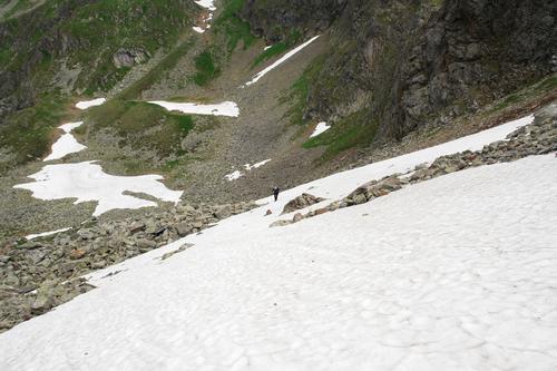 Während ich mit den relativ neuen Winterbergschuhen recht guten Grip habe, tut sich Ingrid mit ihren abgewetzten Sommerbergschuhen wesentlich schwerer.