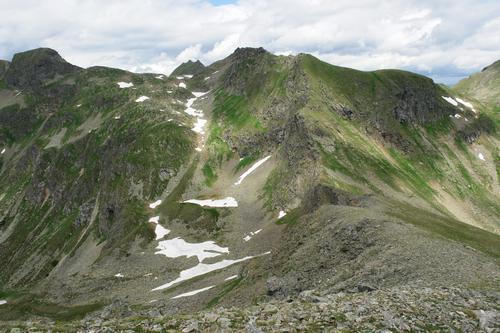 Der Sauofen in Bildmitte. Links der Bildmitte der teilweise schneegefüllte Graben, in dem wir in Richtung der Sauofenseen abgestiegen sind.