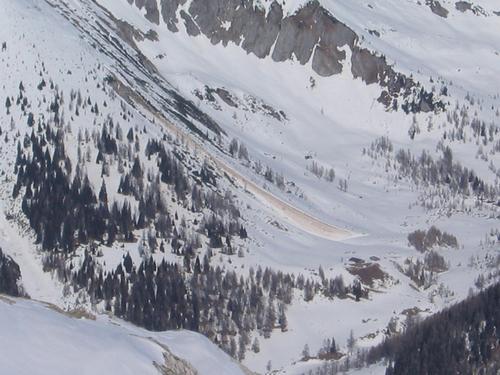 Aus etlichen sonnenbeschienenen Steilhängen sind größere Grundlawinenabgänge erkennbar.
