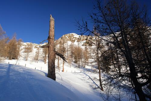 Hier hält man sich nun links und steigt im lichten Wald westwärts.