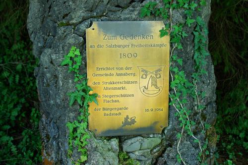 | Beim Abstieg entdecken wir eine Tafel, die uns beim Aufstieg entgangen war: Erinnerung an die Salzburger Freiheitskämpfe. Internet sei Dank können sich Interessierte ausgiebig darüber informieren. |