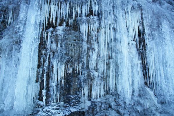 Zunächst führt der Weg etwa 600 Meter am nördlichen (linken) Seeufer auf der Uferstraße an bizarren Eiskaskaden vorbei.