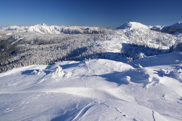 Im Osten weiteres weitläufiges, herrliches Schneeschuhgelände zwischen Plassen (links) und Schwarzkogel (rechts).
