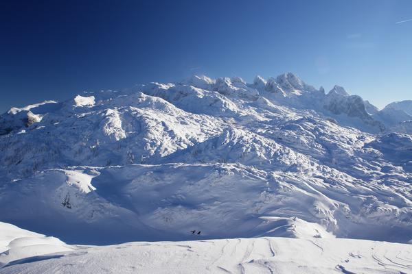 Schließlich stehen wir auf der Hinteren Seekarwand und überblicken das Gebiet bis zu den höchsten Dachsteingipfeln.