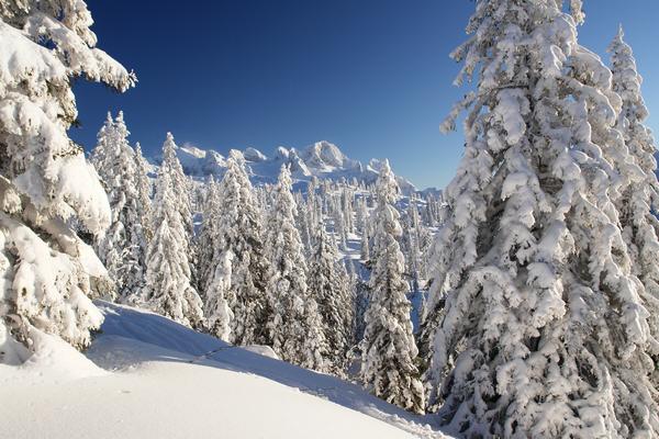 ... ehe es dann im Wald wieder abwärts geht. Zunächst recht flach (mit Ausblick zu den Dachsteingipfeln) ...