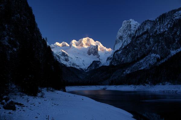 Kurz vor Sonnenuntergang erreichen wir schließlich wieder den Vorderen Gosausee, wo uns der schneebedeckte Dachstein in den letzten Sonnenstrahlen des Tages mit seinem prächtigem Antlitz in seinen Bann zieht. |