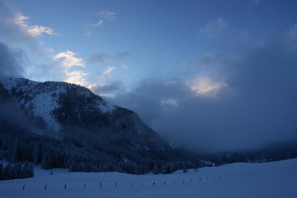 | Früher Aufbruch bei der noch einsamen und stillen Vordergnadenalm. Wir vertrauten der Wettervorhersage, die bereits für den Vormittag wolkenlosen Himmel verkündete, um schöne Fotos vom Spirzinger in der Morgensonne zu machen. |