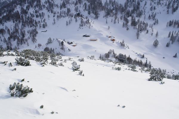 | Im unschwierigen, und von Extremsituationen abgesehen auch weitgehend ziemlich lawinensicheren Aufstiegsgebiet über den latschenbewachsenen Südostrücken des Spirzinger. Tiefblick zur Oberen Pleißlingalm mit der Südwiener Hütte. |