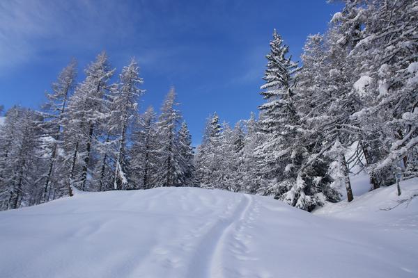 | Kurzzeitig verlassen wir vorgegebene Pfade, um im Wald unberührte Schneeflächen zu spuren. Die erstaunlichen Schneemassen mit Einsinktiefen weit jenseits der Kniehöhe lassen uns aber wieder gerne zur Almstraße zurückkehren. |