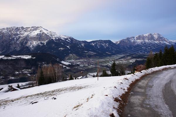 Blick hinab über Gröbming. Darüber der Kammspitz (links) und der Grimming (rechts).