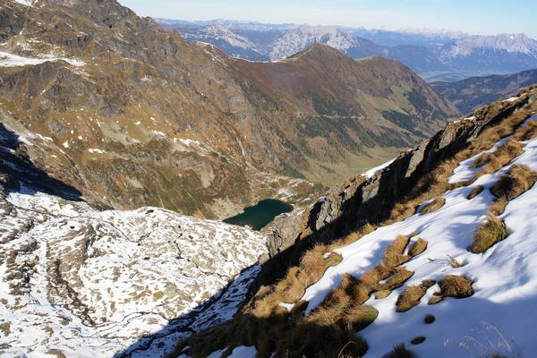 Der Tiefblick auf den Stierkarsee weckt die Vorfreude auf den Besuch bei diesem Gewässer, welches bereits unterhalb der Schneegrenze liegt.