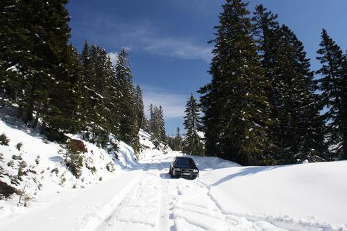 | Die Auffahrt mit dem Auto über die oberhalb von 1.200 Meter Höhe schneebedeckte Stoderstraße durfte man nicht unterschätzen. Dieser PKW schaffte es immerhin noch etwas höher als wir (offiziell war die Straße ohnehin noch gesperrt). |