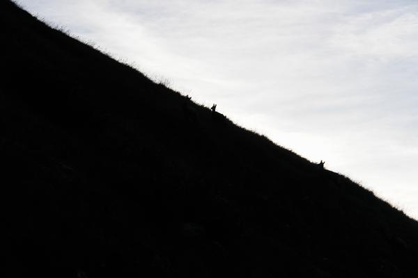 | Über steile Wiesenhänge mit hohem, weichen Grase (und gelegentlich mit Stechgras) und kaum höheren Sträuchern, zuerst links einer markanten, ausgewaschenen, felsigen Rinne, dann in dieser und zuletzt schließlich rechts von ihr steige ich bis zu den größeren Latschenfeldern im obersten Bergbereich auf. Etliche Gämse beim Frühstück auf den Wiesenhängen. |