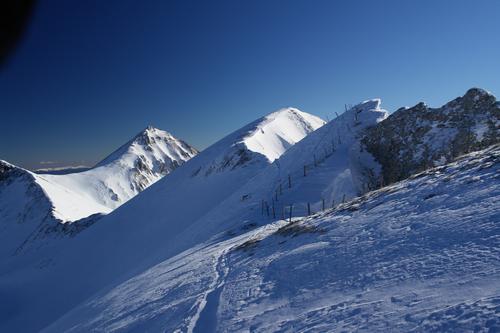 | Da ich die Felle oben am Grat schon abgenommen habe, und bei dieser Kälte keine Chance mehr besteht, daß sie noch einmal auf den Schiern kleben, muß ich den letzten Aufschwung hinaufbretteln. |